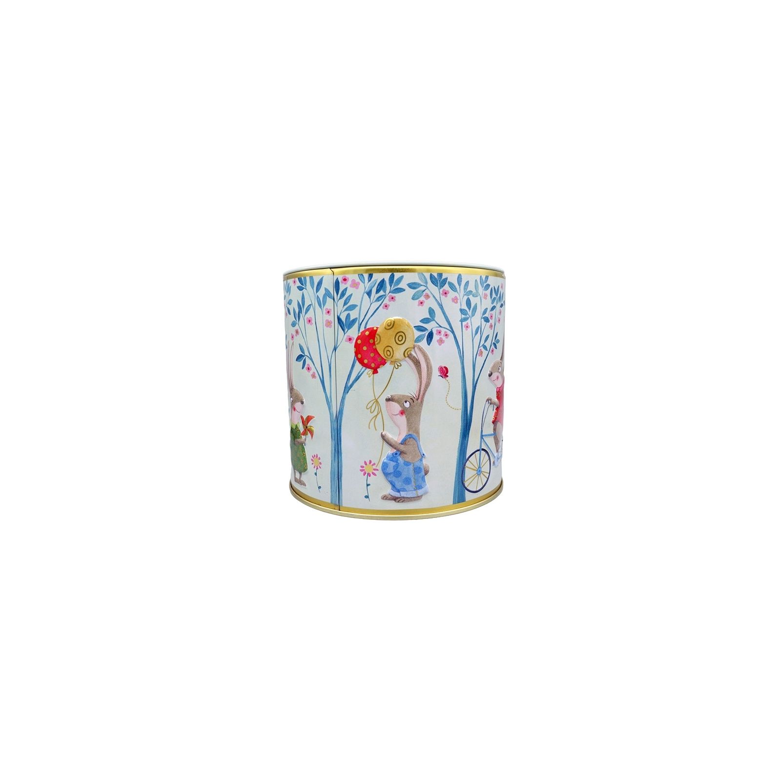 Scatola in latta con decori in rilievo contenente gelatine di frutta.