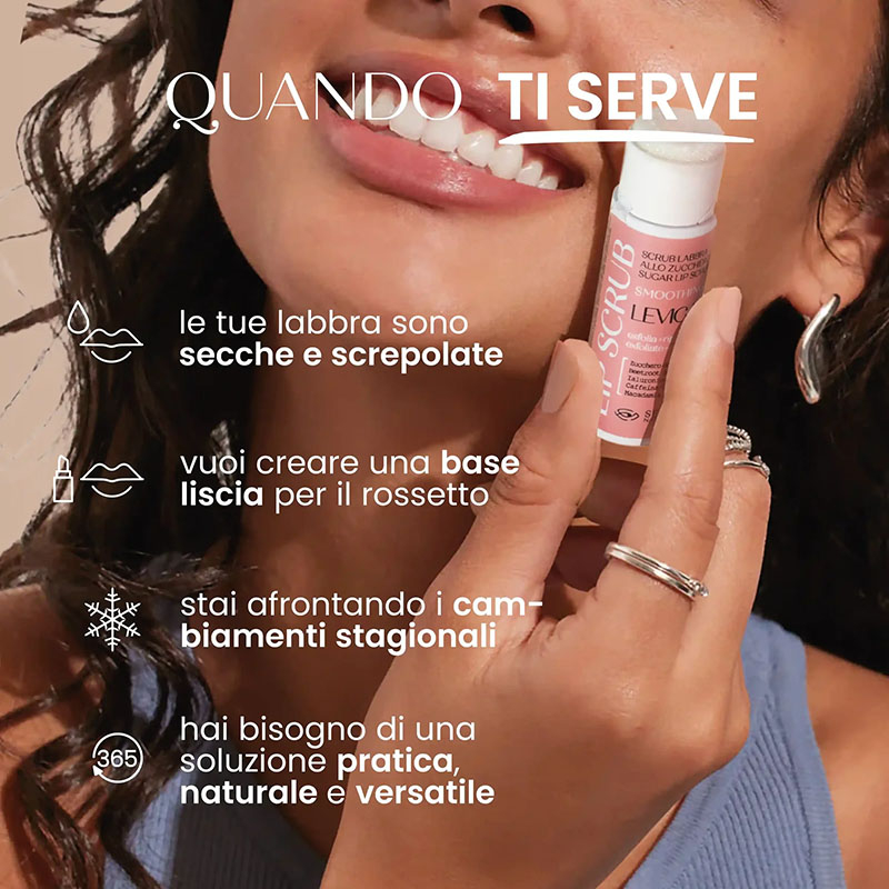 - Esfolia, idrata e ravviva il colore naturale delle labbra