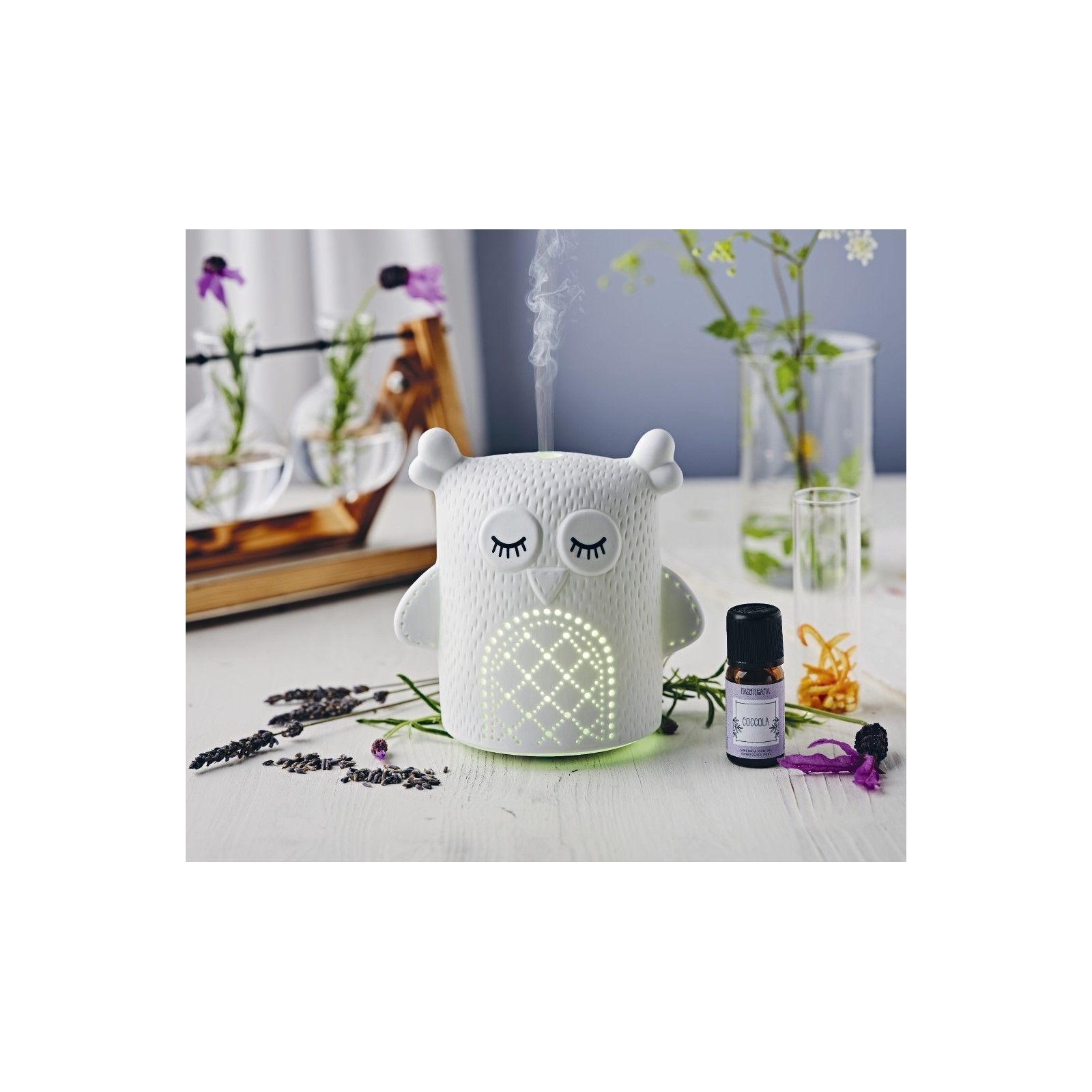 Birdy, grazioso diffusore in ceramica lavorato artigianalmente, si ispira al gufo portafortuna; dai fori fatti a mano si diffonde un suggestivo gioco di luci per un'atmosfera serena e rilassante.