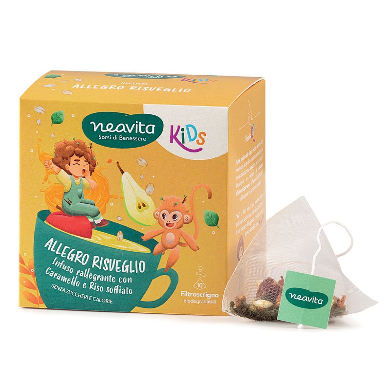 L'Infuso "Allegro Risveglio" di Neavita è una miscela rallegrante pensata per i più piccoli. Confezionato in pratici filtri, questo infuso combina la delicatezza del riso soffiato, del biscotto e delle mandorle con la freschezza della mela e un tocco di cannella. Una coccola avvolgente ideale per iniziare la giornata con dolcezza.