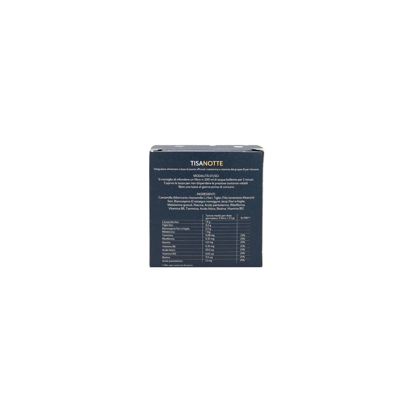 - Melatonina:contribuisce alla riduzione del tempo necessario per prendere sonno, migliora il ritmo sonno-veglia e riduce gli effetti del Jet-Lag. La sua composizione in microgranuli permette un rapido discioglimento senza alterare il sapore della tisana.