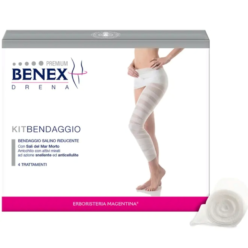 Rivoluziona la tua body care routine con il Kit Bendaggio Premium Benex. Un trattamento intensivo di 1 mese a base di Sali del Mar Morto studiato per combattere la ritenzione idrica e ridurre visibilmente la cellulite sin dalla prima applicazione.